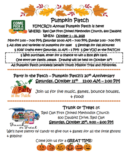 Come and celebrate the Pumpkin Patch's 20th Anniversary at FUMC's "Party in the Patch". There will be live music, games, bounce houses, and food!